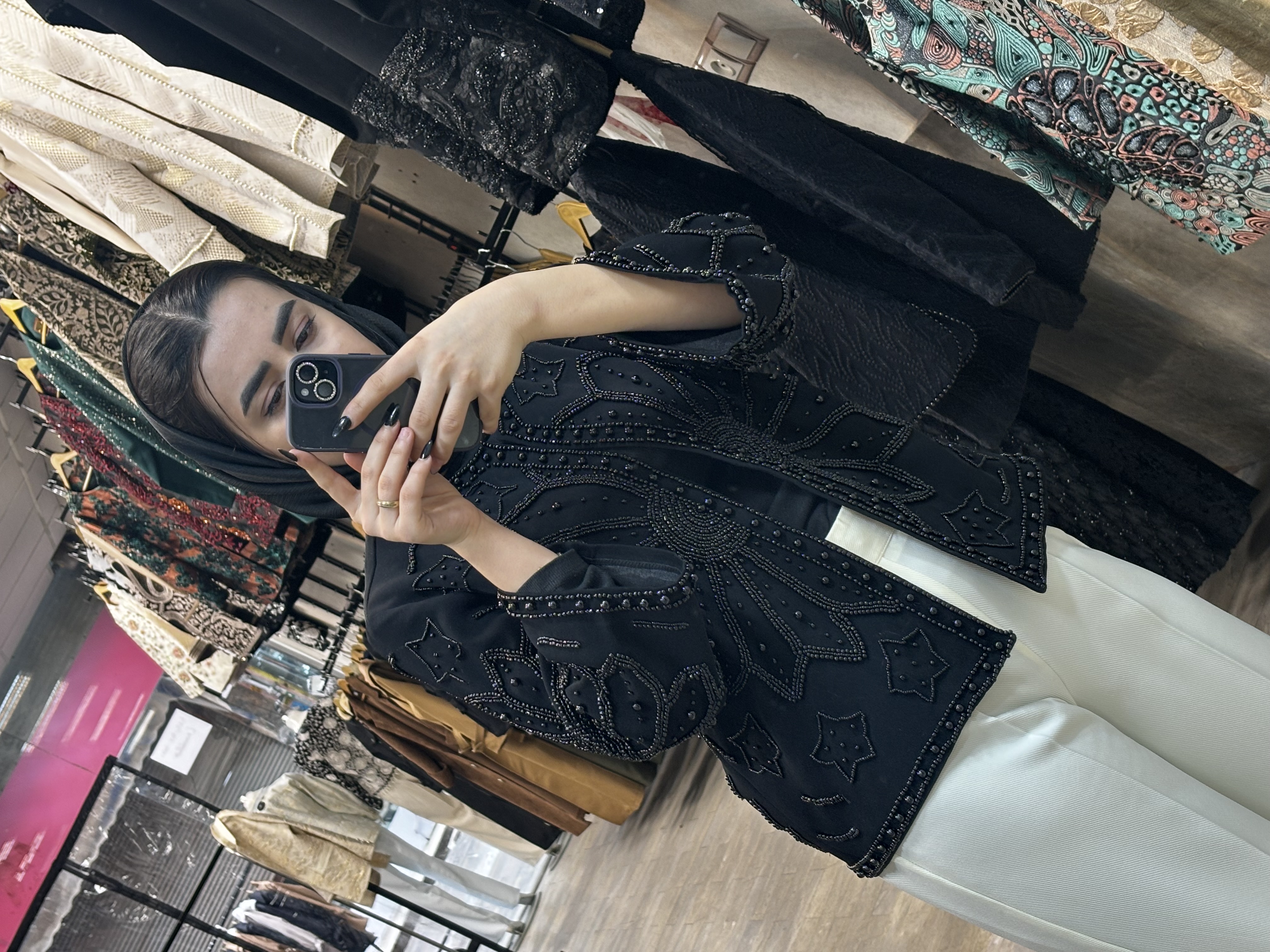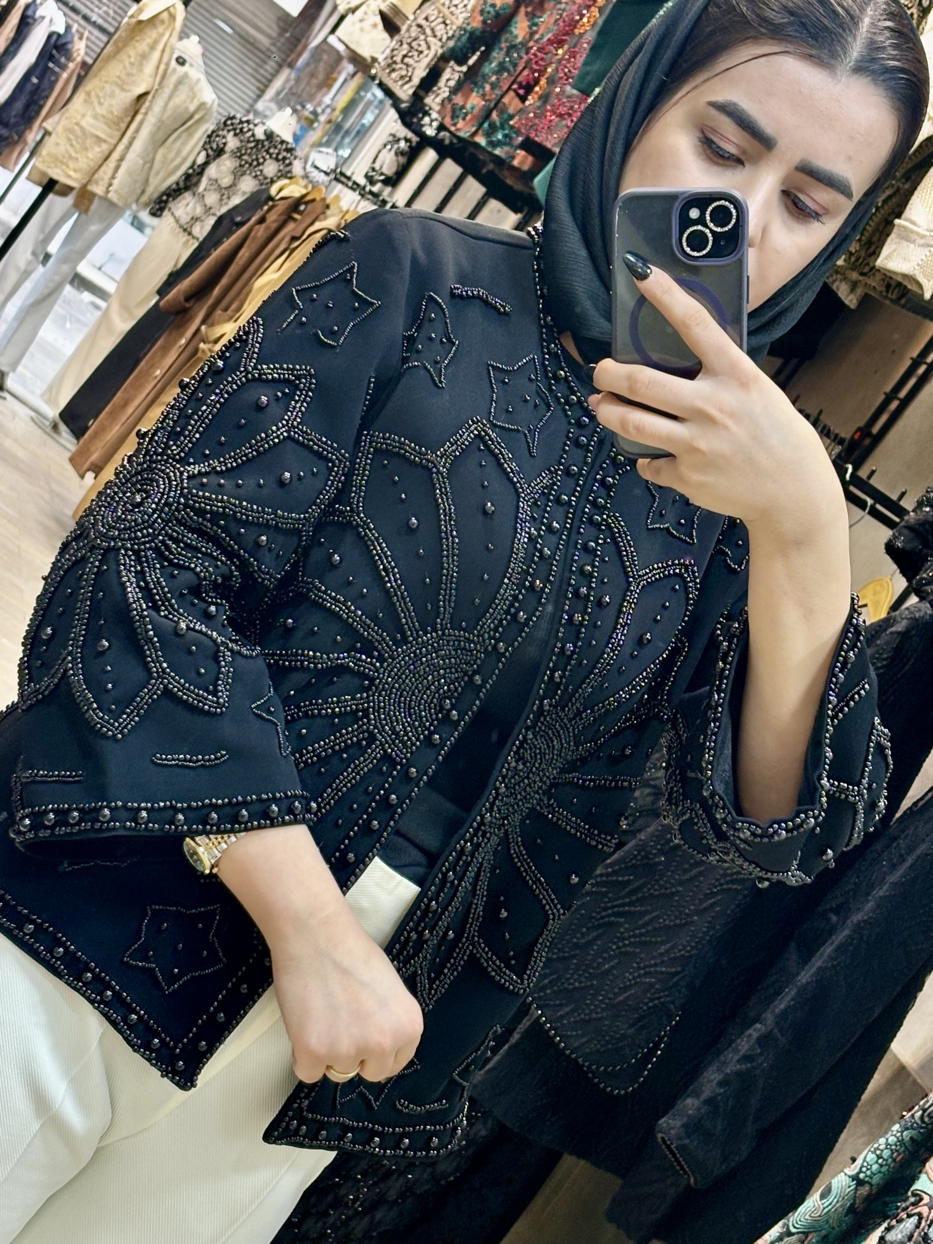 کراپ کت مجلسی تماما کارشده پشت کار همتماما کارشده جنس پارچه :کرپ کنزو سایز بندی ۳۸تا ۴۶ کیفیت دوخت و پارچه عالی